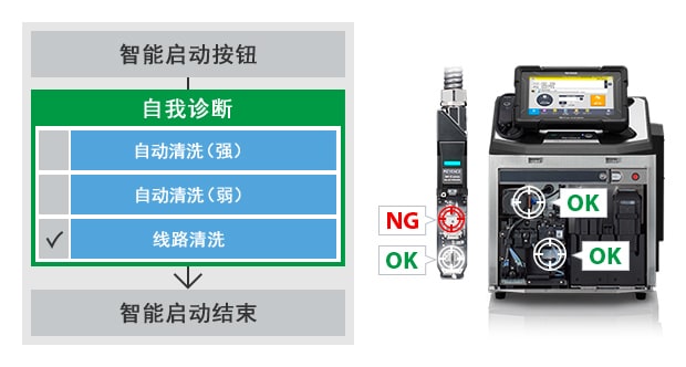 只需按下“智能啟動按鈕”,即可完成MK-G 系列的啟動操作。打印機能夠掌握自身狀態,自動選擇必要的清洗方法。打印機會根據需要采取適當的措施。這樣一來,可以大幅降低清洗用補充液的使用量,大幅削減運行成本。