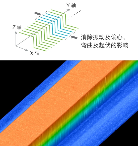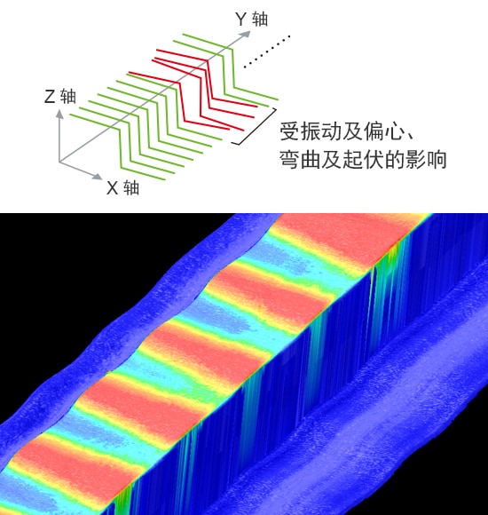 生成3D圖像時,分別用 X?Z?θ 補償2D輪廓的位置。消除振動、偏心、工件彎曲及起伏等影響,生成適于檢測的圖像。