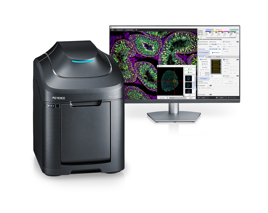BZ-X1000 系列是一款一體化熒光顯微鏡,具有先進的觀察功能、全電動操作系統,可實現即時目標采集、高級成像和尖端分析功能。 與傳統型號相比,成像速度快5倍,分辨率高3.5倍,有助于提高研究人員的工作效率。 無需暗室,占地面積只有 A3紙大小。 配備單色/彩色可切換的1000萬像素CMOS相機,可進行高分辨率觀測。 大型電動云臺可立即接近所需位置,高速自動對焦和拍攝條件再現功能可確保觀察結果不受操作員的影響。 除了無熒光模糊的高分辨率成像和多孔板整個表面的自動批量成像外,還可按設定的時間間隔進行明視野、熒光和相襯的延時成像。 此外,對熒光顯微鏡至關重要的圖像分析量化功能也實現了自動化,具有豐富的分析功能,包括三維分析、動態分析和自動時間序列量化。