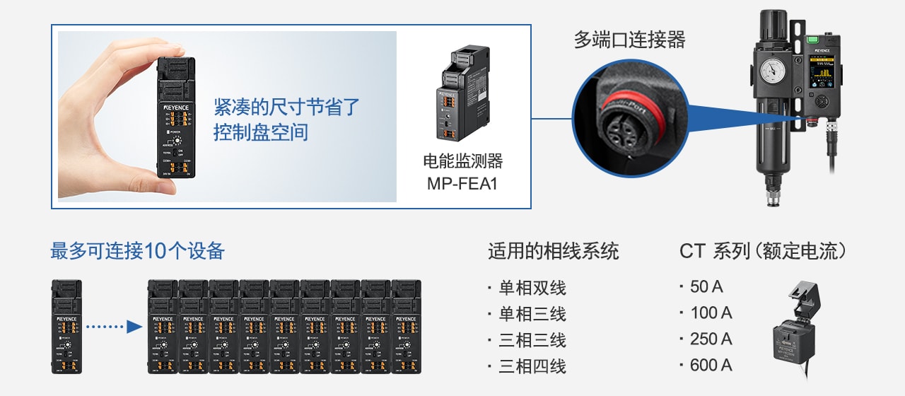 MP-F 系列可在連接到MP-FEA1電能監測器時,同時收集設備耗電量數據。通過直觀地顯示每臺設備的耗電量,可以識別耗電量較高的設備。還可以監測設備中的電機和變頻器的單獨能耗,并比較其各自的電力消耗。