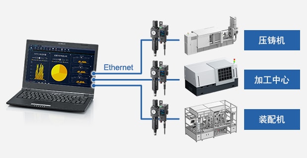 MP-F 系列可輕松實現節能活動中重要設備能源使用量(空氣使用量/用電量)的可視化。1臺即可同時感測空氣壓力、溫度以及濕度。 此外,可利用截止閥從源頭截斷管道避免設備不運行時產生漏氣,實現節能。