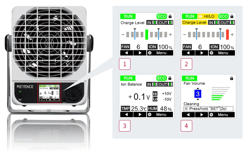 主機配備液晶顯示器。需要時,可根據(jù)屏幕顯示內(nèi)容,簡單明了的確認運行狀態(tài),以及靜電相關(guān)等數(shù)據(jù)。