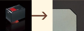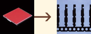 透過包裝薄膜拍攝晶片上的刻印文字。與藍色相比,選擇薄膜透射率更高(散射率較低)的紅色光源可以產生更好的反差。