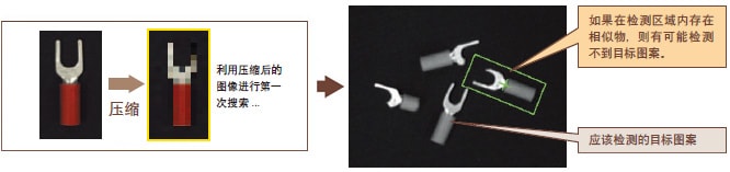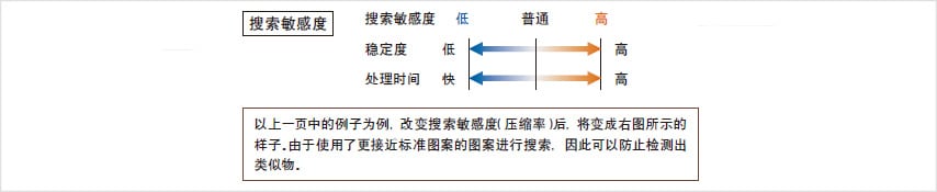 以上一頁中的例子為例,改變搜索敏感度(壓縮率)后,將變成右圖所示的樣子。由于使用了更接近標準圖案的圖案進行搜索,因此可以防止檢測出類似物。
