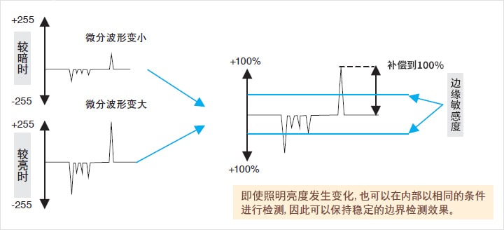 將超過預先設置的“ 邊緣感度(%)”的微分波形的峰值作為邊緣位置。根據濃淡變化峰值的檢測原理,在照度經常發生變化的生產線上也可以穩定的檢測出邊緣。