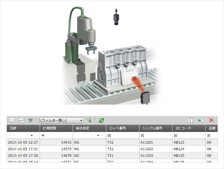 過去要管理檢測結果和歷史圖像,必須自行構建數據庫。而只要利用基恩士的視覺系統專用數據庫“Vision Database(支持CV-X/XG-X系列)”,就能將檢測結果與歷史圖像對應起來,并長期保存,通過日期時間、批號等信息進行輕松搜索。設定簡單,只需連接視覺系統和電腦,選擇需要保存的檢測數據即可。通過將繁瑣的數據庫化工序套裝化,為可視化的實現提供后盾。