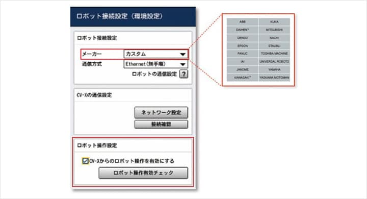 在選擇視覺系統(tǒng)時(shí),請(qǐng)務(wù)必確認(rèn)支持的廠商。在機(jī)械手視覺中已經(jīng)進(jìn)行了相關(guān)說明,不同廠商生產(chǎn)的工業(yè)用機(jī)械手使用的程序語(yǔ)言不同。基恩士的機(jī)械手視覺系統(tǒng)支持國(guó)內(nèi)外17家廠商的產(chǎn)品,對(duì)于混合使用多種工業(yè)用機(jī)械手的生產(chǎn)線,也能靈活應(yīng)對(duì)。