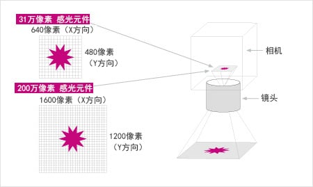 例如,假設(shè)使用了31萬(wàn)像素和200萬(wàn)像素的相機(jī)。31萬(wàn)像素的Y方向像素?cái)?shù)為480像素,200萬(wàn)像素則為1200像素。