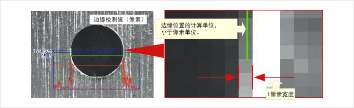 亞像素是將像素細(xì)分化后的單位,例如在基恩士的視覺(jué)系統(tǒng)中,可以獲取的尺寸數(shù)據(jù)最小單位為1/1000像素。