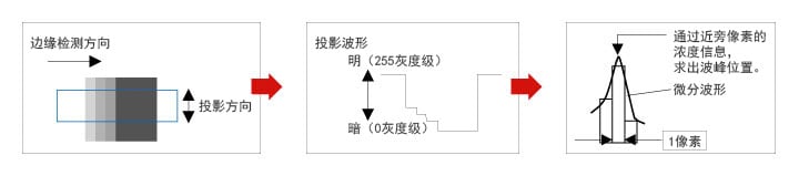 亞像素處理中,將檢測(cè)代表明暗對(duì)比度變化邊界的邊緣,并將其轉(zhuǎn)換為投影波形,施加微分處理。再將微分波形中的峰值點(diǎn)作為邊緣點(diǎn)進(jìn)行計(jì)算。